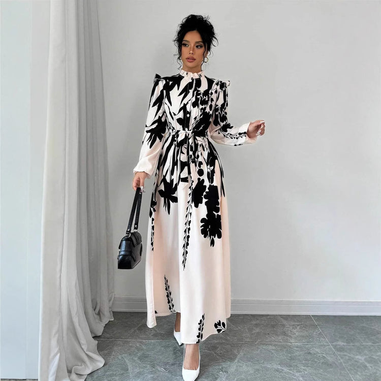 La taille est marquée par une ceinture assortie qui permet d’ajuster la robe selon vos envies, soulignant la silhouette avec délicatesse. Les manches longues et légèrement bouffantes apportent une touche sophistiquée et féminine, parfaite pour un look chic et intemporel.